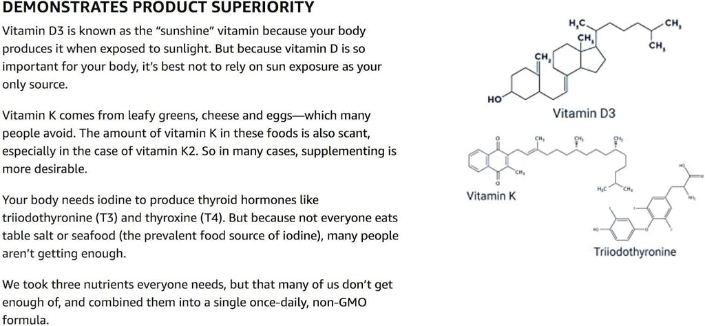 Serving Size: 1 Capsule. Ingredients: Vitamin D3 (as cholecalciferol), Vitamin K1 (as phytonadione), Vitamin K2 (as menaquinone-4), Vitamin K2 (as trans menaquinone-7), Iodine [from Sea-Iodine™ Complex Blend (organic kelp and bladderwrack extracts, potassium iodide)]. Other ingredients: microcrystalline cellulose, vegetable cellulose (capsule), maltodextrin, food starch-modified, dicalcium phosphate, stearic acid, silica.