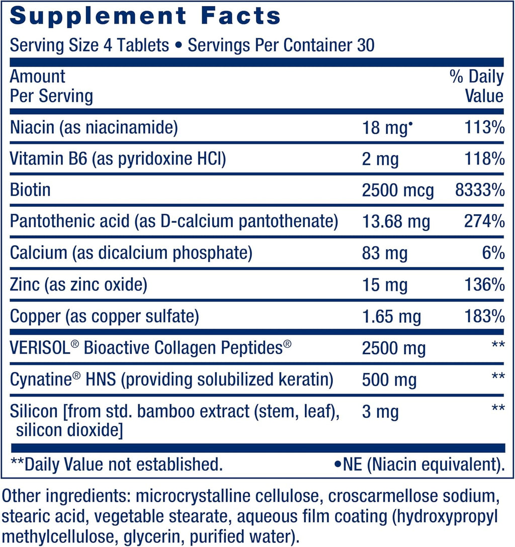 Niacin (as niacinamide) 18 mg• Vitamin B6 (as pyridoxine HCl) 2 mg Biotin 2500 mcg Pantothenic acid (as D-calcium pantothenate) 13.68 mg Calcium (as dicalcium phosphate) 83 mg Zinc (as zinc oxide) 15 mg Copper (as copper sulfate) 1.65 mg VERISOL® Bioactive Collagen Peptides® 2500 mg Cynatine® HNS (providing solubilized keratin) 500 mg Silicon [from std. bamboo extract (stem, leaf), silicon dioxide] 3 mg Other ingredients: microcrystalline cellulose, croscarmellose sodium, stearic acid, vegetable stearate, aqueous film coating (hydroxypropyl methylcellulose, glycerin, purified water).