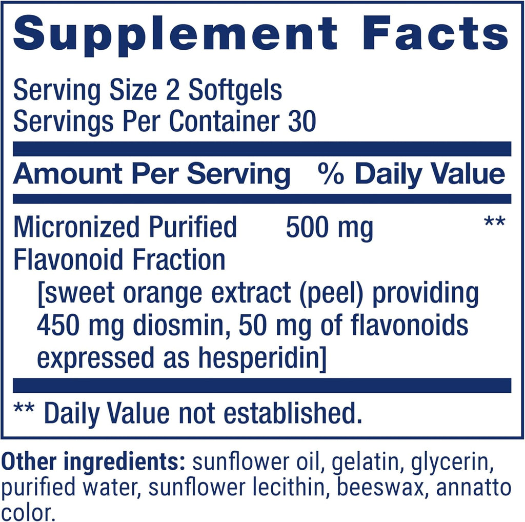 Micronized Purified Flavonoid Fraction [sweet orange extract (peel) providing 450 mg diosmin, 50 mg of flavonoids expressed as hesperidin] 500 mg Other ingredients: sunflower oil, gelatin, glycerin, purified water, sunflower lecithin, beeswax, annatto color.