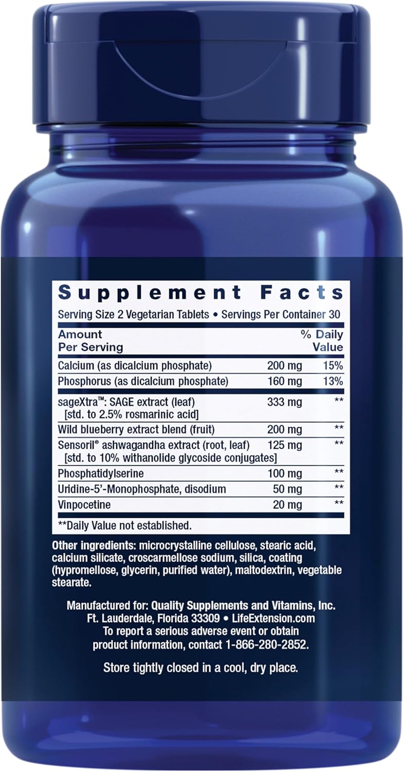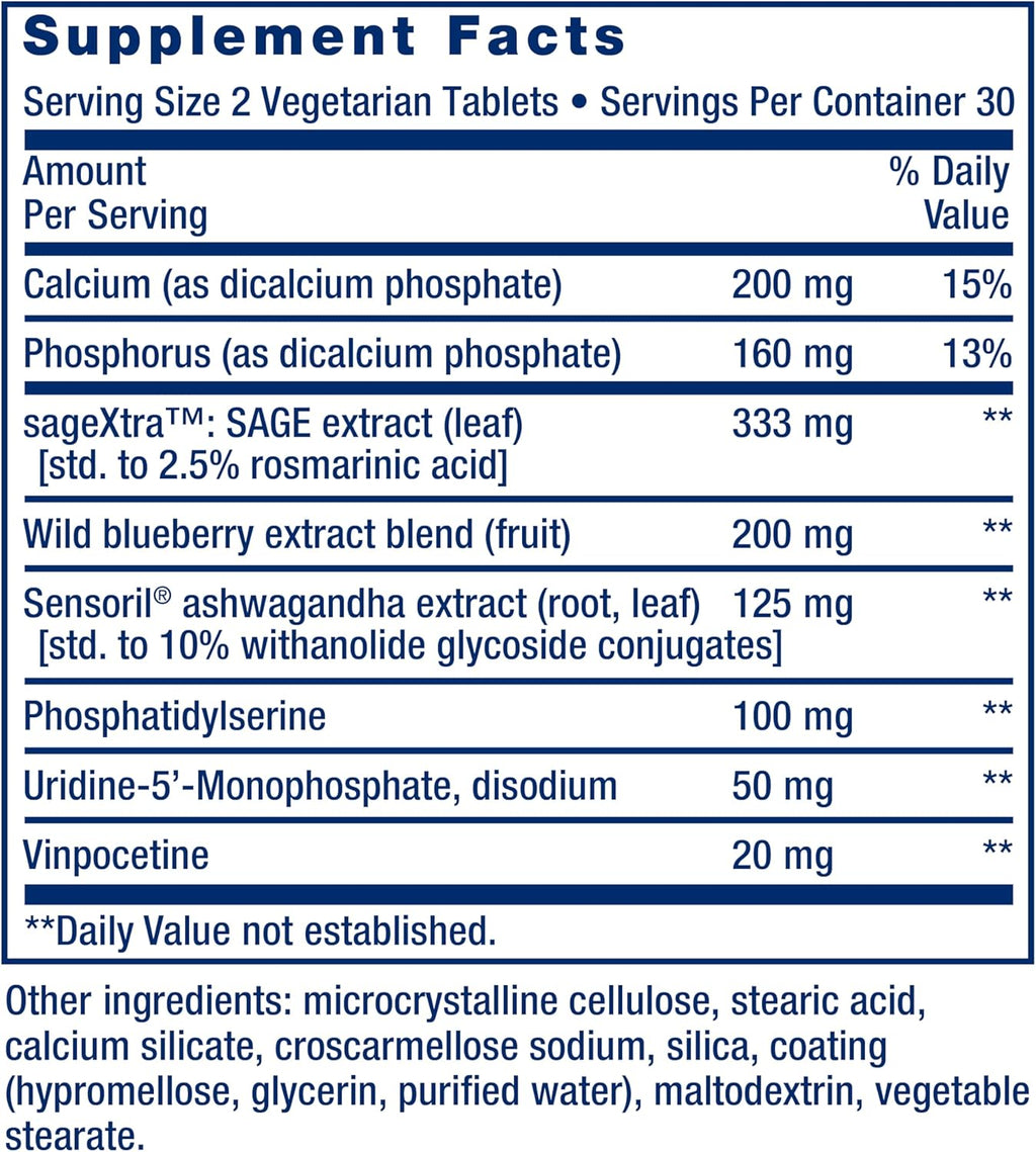 Calcium (as dicalcium phosphate) 200 mg Phosphorus (as dicalcium phosphate) 160 mg SIBELIUSTM: SAGE extract (leaf) [std. to 2.5% rosmarinic acid] 333 mg Wild blueberry extract blend (fruit) 200 mg Sensoril® ashwagandha extract (root, leaf) [std. to 10% withanolide glycoside conjugates] 125 mg Phosphatidylserine 100 mg Uridine-5’-monophosphate, disodium 50 mg Vinpocetine 20 mg Other ingredients: microcrystalline cellulose, stearic acid, calcium silicate, croscarmellose sodium, silica, coating (hypromellose, glycerin, purified water), maltodextrin, vegetable stearate. Non-GMO Sensoril® is a trademark of a Kerry Company. SIBELIUS is a trademark of Sibelius Limited CHRONOSCREEN™
