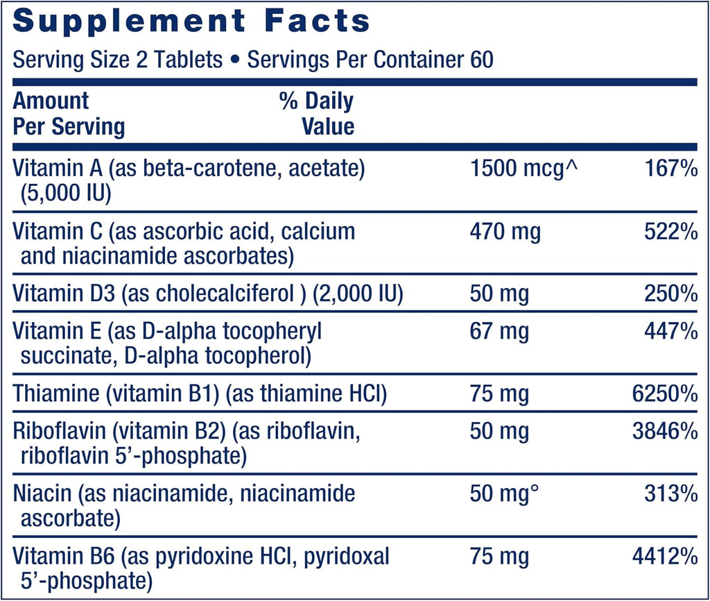 Vitamin A (as beta-carotene, acetate) (5,000 IU) 1500 mcgˆ Vitamin C (as ascorbic acid, calcium and niacinamide ascorbates) 470 mg Vitamin D3 (as cholecalciferol) (2,000 IU) 50 mcg Vitamin E (as D-alpha tocopheryl succinate, D-alpha tocopherol) 67 mg Thiamine (vitamin B1) (as thiamine HCI) 75 mg Riboflavin (vitamin B2) (as riboflavin, riboflavin 5’-phosphate) 50 mg Niacin (as niacinamide, niacinamide ascorbate) 50 mg• Vitamin B6 (as pyridoxine HCI, pyridoxal 5’-phosphate) 75 mg Folate (as L-5-methyltetrahydrofolate calcium salt) 680 mcg° Vitamin B12 (as methylcobalamin) 300 mcg Biotin 300 mcg Pantothenic acid (as D-calcium pantothenate) 50 mg Iodine (as potassium iodide) 150 mcg Magnesium (as magnesium oxide) 100 mg Zinc (as zinc citrate, L-OptiZinc® zinc mono-L-methionine sulfate) 25 mg Selenium [as sodium selenite, SelenoExcell® high selenium yeast, Se-methyl L-selenocysteine] 200 mcg Manganese (as manganese citrate, gluconate) 2 mg Chromium [as Crominex® 3+ chromium stabilized with Capros® amla extract (fruit), PrimaVie® Shilajit] 200 mcg Molybdenum (as molybdenum amino acid chelate) 100 mcg Inositol 50 mg Alpha lipoic acid 25 mg Natural mixed tocopherols (providing gamma, delta, alpha, beta) 20 mg Bio-Quercetin® Proprietary Blend Providing 35% quercetin (5 mg) [from Japanese sophora concentrate (flower bud)], 30% galactomannans (4 mg) [from fenugreek (seed]) 14 mg Marigold extract (Tagetes erecta) (flower) [std. to 5 mg trans-lutein, 155 mcg trans-zeaxanthin] 11.12 mg Apigenin 5 mg Boron (as boron amino acid chelate) 3 mg Lycopene [from LycoBeads® natural tomato extract (fruit)] 1 mg Other ingredients: Microcrystalline cellulose, stearic acid, croscarmellose sodium, dicalcium phosphate, food starch-modified, silica, vegetable stearate, maltodextrin, coating (purified water, hypromellose, glycerin), sunflower lecithin, sunflower oil. ^RAE (retinol activity equivalents). °DFE (dietary folate equivalents). •NE (niacin equivalents)